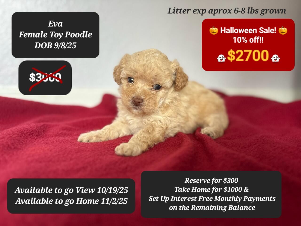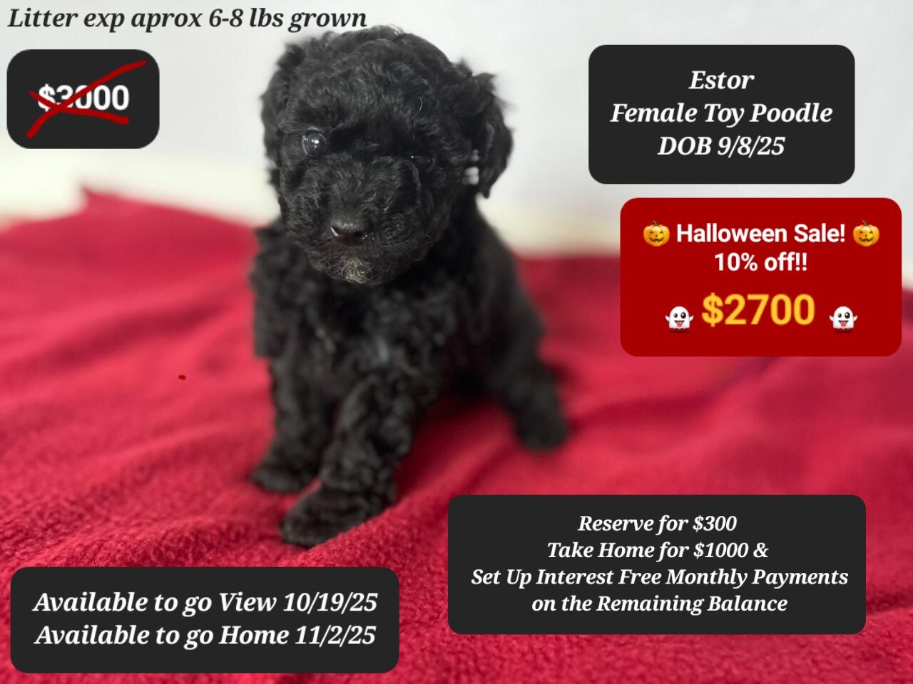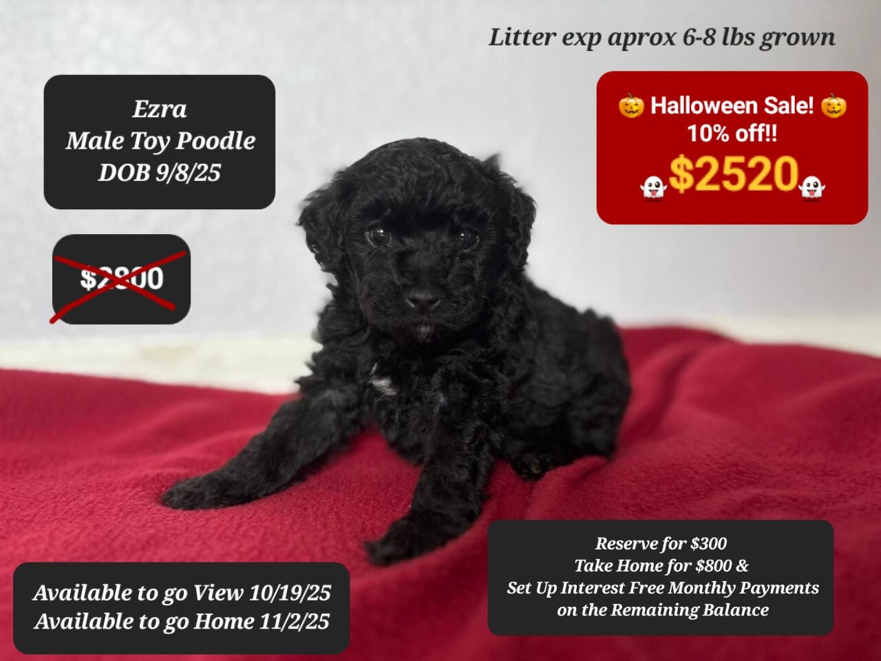 You can take a puppy home on deposit and set up interest free payments on the balance!